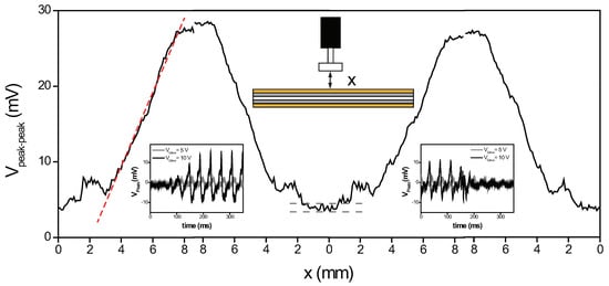 Tactile sensing response as a function of the contact separation. The piezoelectric peak–to–peak voltage is monitored while the contact distance x between the sensing element and the glass plate is varied. Between the loading ( mm) and unloading ( mm) of the physical contact, a linear increase and decrease in the sensing signal can be observed. When repeated, the sensing element shows a steady response. The red dotted line is a linear fit with a slope of 4.9 mV/mm. In addition, a pair of gray dotted lines in the middle indicates the measurement uncertainty (∼1 mV) in this experiment, which results in the minimum detectable contact separation around 200 μm. The insets show the time-transient curves when the contact is removed (inset on left) and when the contact is made (inset on right) under two different drive voltages of 5 and 10 V.