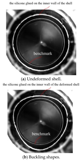 Both the experimental and numerical simulation results were listed in Table 2. The experimental buckling pressure of the A#, B# and C# cylinders are 3.06 MPa, 3.12 MPa and 3.09 MPa, respectively. The deviations of the predicted buckling pressures of the A#, B# and C# cylinders from the experimental results were 1.31%, 3.21% and 2.27%, respectively. In the experiment, a high-speed camera was used to observe the large deformation of the shell. Figure 4 show the structural morphology of the undeformed (Figure 4a) and buckling shape (Figure 4b). There are two white circles in Figure 4; the larger circle represents the silicone glued on the inner wall of the shell, and the smaller circle is the benchmark. By comparing the small circle with the deformed large circle, the peaks and troughs can be distinguished clearly. As for the buckling modes, three waves were clearly visible and evenly distributed in the circumferential direction according to the experimental observation (Figure 4b) and finite element prediction (Figure 5). Comparing the numerical simulation and test results, it was shown that the numerical method accurately calculated the buckling pressure, and reasonably predicted the buckling mode of filament-wound composite cylindrical shell under external hydrostatic pressure.
