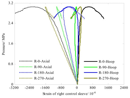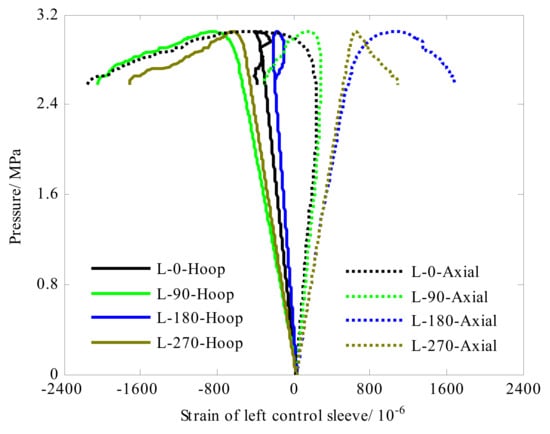 Eight strain gauges were evenly attached along the circumference (0°, 90°, 180° and 270°) in the left and right control sleeves, respectively. Each strain gauge can measure axial strain and hoop strain. The strain responses of the left control sleeve were shown in Figure 6. Under the compressive load of the hydrostatic pressure environment, in axial direction the left control sleeve exhibited positive strain, and in hoop direction it presented negative strain. As for the right control sleeve (see Figure 7), it was interesting that the strain response exhibited negative strain in axial direction and positive strain in hoop direction. This phenomenon can be attributed to the difference in boundary conditions in both ends. For the boundary condition at the left end, it was fixed and connected to the flange of the hydrostatic pressure. Under the action of hydrostatic side pressure, the left control sleeve was compressed circumferentially. Considering the isotropic characteristics of metal materials, the hoop compression of the skirt would cause axial elongation, so that the strain response of the skirt presented hoop compression and axial tension. For the boundary condition at the right end, under the action of axial pressure, the rigid end disk flexed inward, causing additional bending moment. The additional bending moment was transferred to the right control sleeve, where the circumferential expansion occurred. Taking the isotropic characteristics of metal materials into account, expansion in the circumferential direction would cause axial compression of the right control sleeve. In the test, the critical buckling load of the composite cylindrical shell was 3.06 MPa. As shown in Figure 6 and Figure 7, strain response of control sleeve was basically linear with the external load until the shell collapsed.