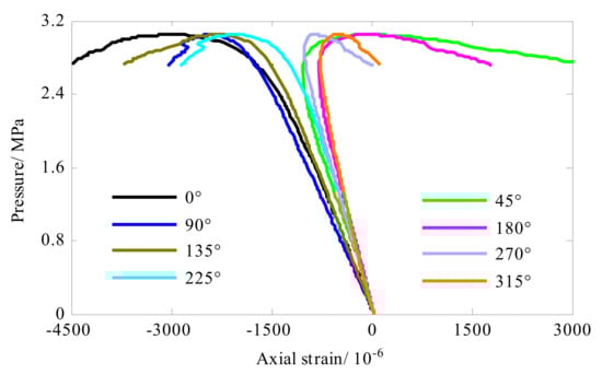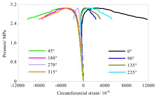 In the middle of the length of the shell, eight strain gauges were distributed evenly along the circumference direction (0°, 45°, 90°, 135°, 180°, 225°, 270° and 315°). Each strain gauge can measure axial strain and hoop strain. The axial strain and hoop strain of the composite cylindrical shell were shown in Figure 8 and Figure 9, respectively. Before the shell buckled, the strain response was linear with the load and presented compressive. As the external pressure approached the buckling load, the strain response gradually became nonlinear. Then, the bearing capacity of the shell gradually decreased. For circumferential strain (see Figure 8), the strain of measuring points (0°, 90°, 135° and 225°) changed from compressive strain to tensile strain. The strain value of the remaining measuring points continued to increase until the shell collapsed. That was to say, when the shell entered the post-buckling stage, the strain bearing capacity was weakened, and strain response in hoop direction of some measuring points (0°, 90°, 135° and 225°) was reversed. For axial strain (see Figure 9), strain reversal occurred at 45°, 180°, 270° and 315° locations. In summary, in the post-buckling stage, the strain reversal occurred at all the measuring points, some of the measuring points showed the axial strain reversal, and the remaining measuring points present the hoop strain reversal. Additionally, comparing Figure 9 and Figure 10, it was found that the axial compressive strain of the shell was significantly smaller than the hoop compressive strain in the linear stage. This meant that the axial stiffness of the shell was greater than the hoop stiffness.