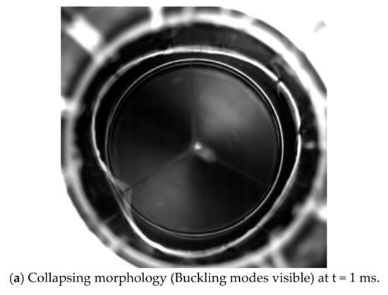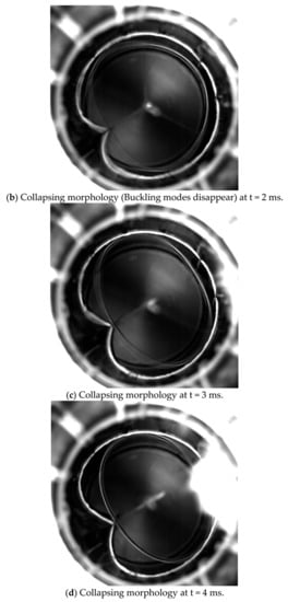 The collapsing morphology observed in test was shown in Figure 10. At the moment of collapse (see Figure 10a at t = 1 ms), the buckling mode of the composite cylindrical shell was visible. In the next instant (see Figure 10b at t = 2 ms), the buckling mode of the shell disappeared, and the shell returned to its original shape. Immediately after, water rushed into the composite shell (see Figure 10c,d at t = 3 ms t = 4 ms). In the extremely short time, the pressure in the static pressure chamber dropped sharply. The crushing positions of the three composite cylindrical shells have a common feature, that is, they are all located at the troughs in the buckling waveform. The circumferential stiffness of the shell was inherently weak, and after the buckling and large deformation, the circumferential wave trough further reduced the circumferential bending stiffness of the shell. Therefore, in the post-buckling stage, the bearing capacity of the shell gradually decreased, and strength failure occurred at the trough. Subsequently, the failure extends to both ends, forming an axial crack.