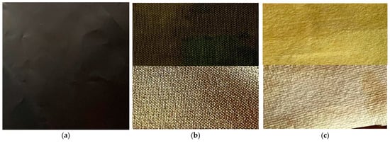 The photo of two sides of the materials (front and back) used for the research: (a) Velostat, (b) Cordura, (c) Goretex membrane.