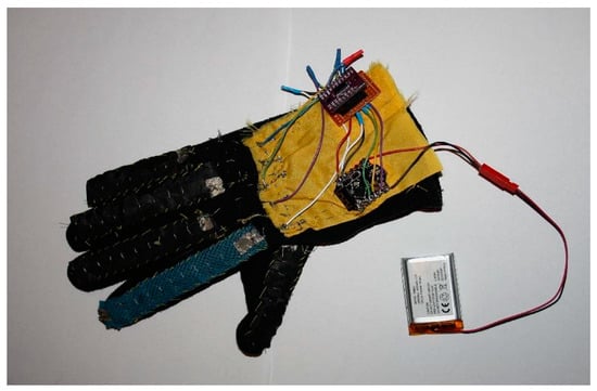 A photo of a glove prototype is presented in Figure 2. The photograph shows an example of the bend sensors created from electroconductive material, placed on each finger, and also the microcontroller, multiplexer, and power supply system. The microcontroller used in the prototype is a Bluno Beetle from DFRobot (Shanghai, China).