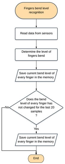 Using the introduced parameter, the algorithm to recognize the finger state was developed. After reading the data from the sensors, every finger was been assigned an appropriate bent state, and the results were saved in the memory. After gathering 20 bent states, they were compared. If all of these were identical, the finger was assigned an actual bent state. The process should be run in a thread, performed every 70 ms. The amount of necessary data to be stored in the memory and the thread frequency were determined experimentally, ensuring the correct operation of the device. The described algorithm is presented in Figure 4.