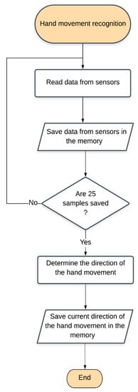 Recognizing the hand movement is executed according to the following algorithm. Data read from an accelerometer is stored in the memory. After storing 25 samples, the direction of the movement is determined and saved as the current hand movement direction. The algorithm ought to be performed every 100 ms. The amount of the necessary acceleration data that have to be stored in the memory and the thread frequency were determined experimentally, ensuring the correct operation of the device (Figure 5).