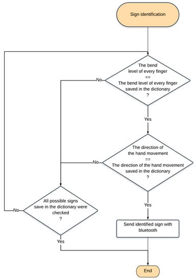 The letter identification is processed by software uploaded in the Bluno Beetle microcontroller. The software used to convert electrical to digital signals is the authors’ own software and it is written in C++ language, based on the presented algorithms. The actual state of a hand is compared with values saved in the memory. The action is performed in a thread every 120 ms, with a higher frequency than that of the threads reading the data from the sensors. When the identification is correct, the letter is transmitted via Bluetooth or UART port. The described algorithm is presented in Figure 6.