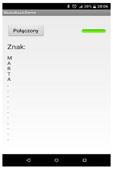 A mobile application for Android 6.0 was developed. It uses the Bluetooth module of the phone, and after pairing the devices, it prints the letter shown using the created glove (Figure 7).