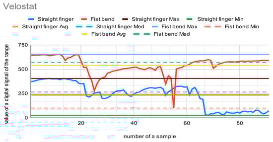 After analysis of Velostat’s behavior in the research, it can be observed that the range of the signal is wide, from 25 to 653 levels. The sensor has a resistance range from approx. 9.2 kΩ (straight sensor, lying flat on horizontal surface) to approx. 9 kΩ (sensor bent at an angle of approx. 170 degrees). Two peaks were registered when testing the bend sensor (between the 25th and 55th samples), but it can be assumed that these are individual measurement errors caused by a temporary lack of continuity in the circuit at points joining the conductive thread and the wires.