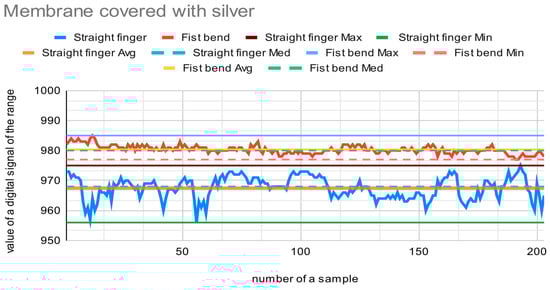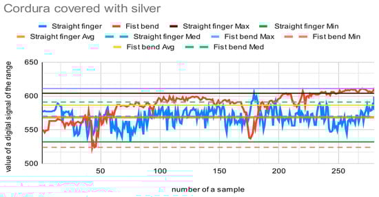 The materials presented in Figure 1 were tested as a core for the sensor in order to choose the most suitable fabric. Each sensor with a different core was placed sequentially on a forefinger and two tests were performed. The first test measured the output of the digital signal from the A/D converter when the finger was straight, and the second test measured the output when the finger was maximally bent. The finger in each position was slightly modified to reflect the natural state of the hand. Fingers recognized as straight may be slightly bent (circa 15 degrees), and fingers bent into a fist may be squeezed more or less firmly. The resolution of the A/D converter used is 10 bits, so it can encode an analog input from 1 to 1023 different levels. Figure 9, Figure 10 and Figure 11 present charts of gathered signals for different core materials. Table 2 shows characteristic values for the measured signals.