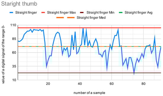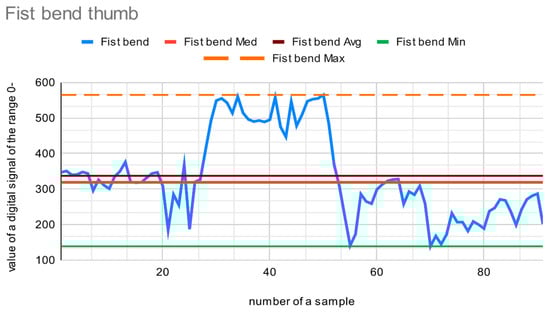 Two measurements were performed: first, when the fingers were straight, and second, when the fingers were maximally bent. During the process, the fingers were moved slightly—into a fist, tightly or slightly clenched, and then relaxed—with the fingers fully and loosely straightened. This was completed to unify the bend level of the measured fingers. It was assumed that the finger is classified as straight when it is bent in an angle up of 0–20° (the bend angle of a fully straightened finger is 0°). The finger is considered to be maximally bent when the bend angle is between 160–190°. This ensures the procurement of a wide range of sensor data from each bending state. The described test was performed once on a single person. The resulting ranges were adjusted during manual testing of the glove, in which the recognition of individual letters was checked. The possible data values were in the range of the 0 to 1023 level. Every finger has its own data values range. Figure 12 displays values gathered for the thumb when maximally bent. The minimal value from the sensor is 139. The maximum is 568. The average is 339 and the median 319. The median and average values are considered to provide perspective regarding the most probable and the most common signal values that may appear.