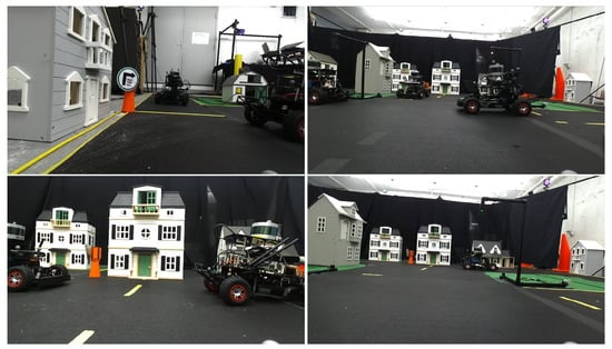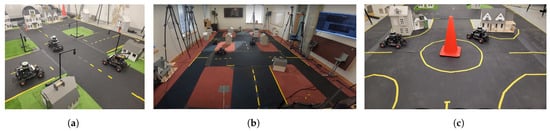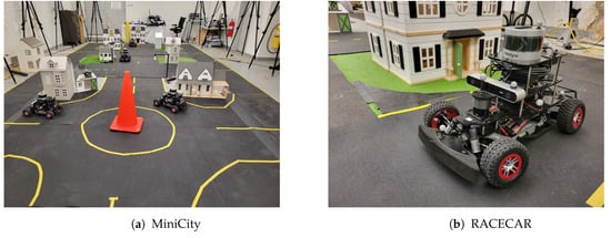 The most comprehensive testing can occur with a full-scale, real autonomous vehicle platform. Full-scale research platforms include MCity [] and individual vehicles such as Stanford’s Audi TTS [], MIT’s Toyota Prius [], UofT’s Zeus [], while allowing for real sensors and varied environments, full-scale hardware is typically prohibitively expensive for most researchers, especially for scenarios requiring multiple autonomous vehicles. In addition, full-scale vehicles require heightened safety concerns, requiring most testing to occur on closed courses with limited interactions with other agents. In contrast, lower-cost research platforms can allow researchers to develop algorithms for the most dangerous scenarios and test autonomous vehicles at their limit, without concern for the safety of the researcher or the expense of the cars. Finally, these factors increase linearly with the number of vehicles, limiting researchers’ ability to test multiple autonomous vehicles simultaneously.