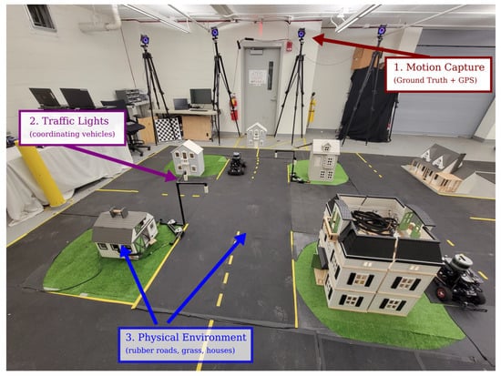 MiniCity Infrastructure. (1) External motion capture, (2) traffic lights, (3) physical roads and houses, and city maps allow multiple vehicles to drive around while testing a vehicle’s perception capabilities.