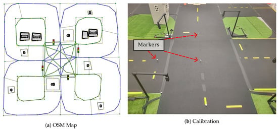 Mapping of the road geometry begins with a rough manual outlining of the road structure of the MiniCity in JOSM, an OSM editor. We then place Optitrack reflective markers on the MiniCity surface (Figure 4b) corresponding to a subset of points on the initial OSM map. Correspondence between the Optitrack locations and the OSM map can be done manually, or automatically using an Iterative Closest Point algorithm for finding transformations between the Optitrack markers and nodes in the OSM. Each road segment and lane is defined within the Lanelet2 framework by providing the left and right road segment boundaries, which are then used by Lanelet2 to infer the direction of the road and generate a routing tree for navigating through the MiniCity.