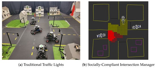 Traffic lights. (a) Multiple vehicles traverse intersections autonomously. (b) Traffic lights can operate in different modes, including intelligent socially-compliant reservation-based intersection managers.