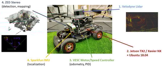 The MiniCity consists of 1/10th scale autonomous vehicles based on the RACECAR [] platform, as shown in Figure 7. We provide configurations for multiple types of sensors and compute which allow for comparing various hardware configurations. The cars dimensions, including all equipment, are 0.53 × 0.30 × 0.33 m (L × W × H). They weigh 5.4 kg and have a turning radius of 1.4 m on the surface of our roads. For computing, the RACECARs use either an Nvidia Jetson TX2 or the newer Jetson Xavier NX, the latter consisting of an NVIDIA Volta GPU, 6-core ARM CPU, and 8GB RAM. The sensor suite is composed of a VLP-16 Velodyne Lidar, a Hokoyu 2d Lidar, a 9DoF Sparkfun IMU, a ZED stereo camera, and an Enertion FOCBOX speed controller that supplies wheel encoder odometry. The enhanced computation and sensing from previous versions of RACECAR and other educational platforms means we can deploy full-scale algorithms on the miniature vehicles.