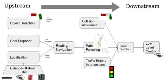 - Gog, I.; Kalra, S.; Schafhalter, P.; Wright, M.A.; Gonzalez, J.E.; Stoica, I. Pylot: A Modular Platform for Exploring Latency-Accuracy Tradeoffs in Autonomous Vehicles. In Proceedings of the 2021 IEEE International Conference on Robotics and Automation (ICRA), Xi’an, China, 30 May–5 June 2021; pp. 8806–8813. [Google Scholar] [CrossRef]