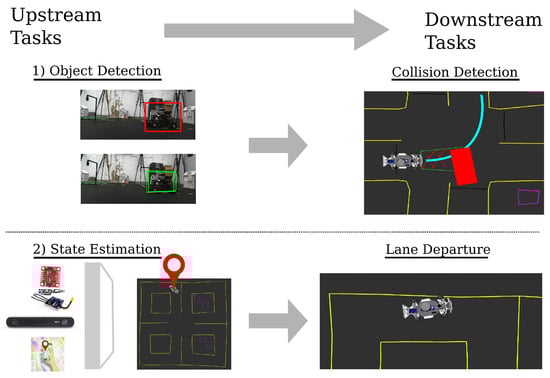 In this work, we focus on two examples of perception tasks, object detection and state estimation. These two tasks represent critical perception tasks that impact driving quality and safety. Figure 9 shows the two tasks—object detection and state estimation/localization—in the context of the upstream and downstream evaluations that are performed in the MiniCity. For object detection, the upstream task is defined as detecting and estimating the 6 degree-of-freedom pose (position and orientation) and bounding boxes of any vehicles within the field-of-view of the ego vehicle. The downstream evaluation occurs at the collision avoidance module, where the object detector is evaluated by its ability to prevent collisions as the vehicle drives through a busy intersection. For our second task, a state estimation pipeline ingests multiple sensor streams to compute a highly accurate and high-frequency estimate of the ego vehicle’s pose in the world frame, and downstream, we look to the lane departures of the vehicle as it navigates the MiniCity to evaluate the optimal sensor configuration.