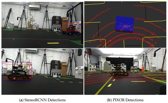 The object detection evaluation begins with deploying each detector on the vehicle while running the full autonomy stack. An ado vehicle navigates the MiniCity autonomously as drone traffic, running its own collision avoidance and control. In addition, a human operator simulates high-risk scenarios such as an ado car speeding through an intersection or stopping at a crossroad. The ego vehicle operates autonomously with a mission of picking up and dropping drivers, using either a camera-based StereoRCNN detector or a PIXOR detector. As mentioned in Section 4, each detector is re-trained on a dataset captured in the MiniCity.