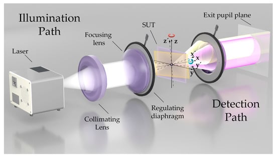 For illustrative purposes, a reflective laser confocal microscope system is deployed. Figure 1 illustrates the light propagation path of a confocal microscope. Without considering the influence of aberration, the collimated Gaussian beam is focused on the object to be measured after passing through the microscope objective [24]. An aperture that is slightly smaller than the diameter of the microscopic objective lens is placed on the focusing side of the objective to reduce the influences of ambient stray light and sidewall of the microscope objective. The diaphragm is regarded as an ideal pupil plane to simplify the proposed model, and the light field distribution of the plane is identical to that of the exit pupil plane of the microscopic objective lens.