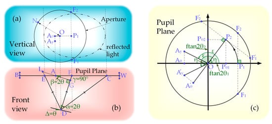 A simple theoretical model is proposed to study the confocal response as a function of the surface tilt. The developed model predicts the relationship between the light intensity distribution at the exit pupil plane and the 2D tilt. To derive this relation, the proposed model considers two conditions. First, the object surface was placed exactly at the front focal plane of the microscope’s objective lens. Second, the objective was considered as an adaxial surface. The first step involved studying the optical system, and an analysis of the top and front views of the focusing system indicates that 1D tilt occurs, as shown in Figure 3a. Based on the first step, we analyzed the 2D tilt, as shown in Figure 3b.