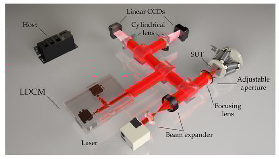 The system structure displayed in Figure 5 was designed to accurately measure the 2D angle deflection of the measured surface in the confocal system. Accordingly, two angle measurement units placed perpendicular to each other were added to the confocal system, and each measurement unit was composed of a cylindrical mirror and a linear CCD detector. The Gaussian beam from the laser converges at the objective of the microscope via a beam splitter and is focused on the surface of the measured object that was deflected in 2D. Once the diaphragm blocks the returning deflected beam, part of the light becomes a collimated beam after it passes through the microscope. After passing through the splitter, the collimated beam is split into two beams. One light beam enters the detection link of the CM or LDCM (the selected diagram depicts the LDCM, and details of the specific structure are not described here). The other beam passes through the beam splitter and enters the detection module composed of the cylindrical mirror and the linear array CCD, which are perpendicular to each other. The linear array CCD transmits the light intensity along with the pixel distribution data to the data acquisition board (DAQ) before sending it to the host computer. The peak-extraction algorithm computes the peak energy positions on the two linear array CCDs, and a stable mapping relationship between the peak position and the angle is obtained by fitting the polynomial surface function. Notably, the DAQ controls the timing of the system in a unified manner. When the objective lens is cyclically scanned, the detector of the differential confocal system or the confocal microscope system records real-time data, and the two linear array CCDs are orthogonal to each other. Data are recorded simultaneously, and the inclination angle is solved using advanced algorithms. The confocal system has a unique axial slicing ability, which enables it to accurately obtain the focal position and time to ensure the angle measurement satisfies the reflection law and ignores the problems caused by the defocused state. Specifically, the return beam is parallel to the proposed sensor, and the confocal structure ensures that the return beam is parallel. Thus, the confocal system is a prerequisite to using the sensor.