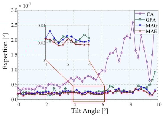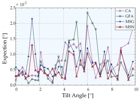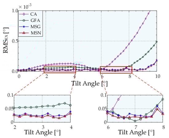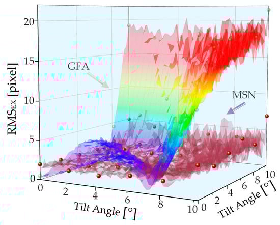 Upon verifying the ability to extract peaks using 1D tilt, we concluded that, when a 2D tilt occurs, the variation trends of the root-mean-square of the extraction error is represented as a function of the angle in the two dimensions of the Gaussian fitting and the MSN algorithms, as displayed in Figure 8. When a 2D tilt angle occurs, the trend of the error as a function of the angle is consistent with that of the 1D tilt.
