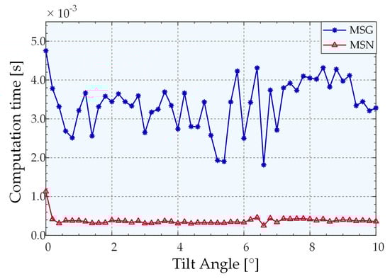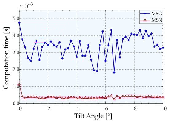To evaluate the computational efficiency of different algorithms, we performed 1000 trails at each angle to avoid randomness and make the simulations reliable. A 2.9 GHz AMD R7-4800 h central processing unit (CPU) was used to compute the average time for extracting angles using various algorithms. The comparison of processing times of the MSG and MSN algorithms are presented in Figure 9. Following the change of the new kernel function, the speed exhibited a considerable improvement, and the processing speed curve of the MSN algorithm changes more smoothly. The average extraction times for CA, GFA, MSG, and MSN were 8.9992 × 10−6 s, 0.0535 s, 0.0064 s, and 0.0004 s, respectively. The processing speed of MSN was 18.15 times higher than that of MSG, and 152.3 times higher than that of Gaussian fitting. MSN can satisfy the speed requirements of the measurement system for the peak extraction algorithm.