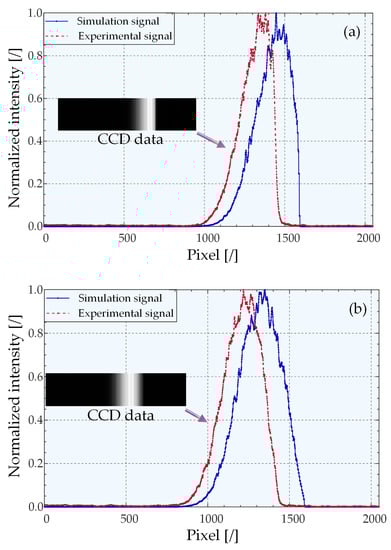 There are differences between the simulation results and the physical experimental results. First, a difference exists in the width at half maximum. Second, the distribution positions cannot overlap. Following normalization, the same energy intensity has a fixed pixel position difference.