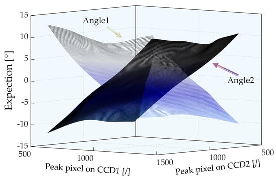 When the measured surface is tilted in one dimension, the light intensity distribution curves on the two mutually perpendicular CCDs are interdependent. Specifically, the energy distribution curves in the two linear array CCDs simultaneously change when the angle in the other dimension changes while the 1D inclination angle remains unchanged. Two specific distribution curves, namely, two specific peak pixel positions, correspond to a 2D tilt angle. Thus, the proposed measurement method must fit two 3D surfaces to represent the real-time 2D tilt of the measured surface. The two surfaces describe the corresponding relationship between the peak positions on the linear CCDs whose deflection angles are perpendicular to each other in space.