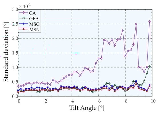 Figure 7 illustrates the peak-extraction error of the four algorithms as a function of the tilt angle when only 1D tilt occurs. Fifty sets of 30 dB random Gaussian noise and speckle model noise were added to each fixed angle noise-free model, and the average value was calculated as the angle peak extraction error. As shown, at the current SNR, the Gaussian fitting and centroid extraction algorithms exhibit strong extraction abilities when there is no tilt or a slight tilt; these abilities are slightly higher than that of MSN. However, as the tilt angle increased, the errors of the centroid algorithm and the Gaussian algorithm were much larger than those of the two algorithms based on the mean–shift algorithm. Meanwhile, the extraction error is consistently smaller than the MSG when using the MSN algorithm, and the mean errors were 0.0438° and 0.0403°, respectively, which proves that the extraction accuracy of the MSN algorithm was higher compared to the accuracy of other algorithms. The variances of the four algorithms were all within the range allowed by the system (<0.0008). Except for the centroid algorithm, there is no phenomenon associated with the increase as a function of the angle. The variance of Gaussian fitting was much smaller than that of the other three algorithms, among which the average variance of MSN was 41.8% less than that of MSG. These outcomes prove that the algorithm has better robustness owing to the change of the kernel function.
