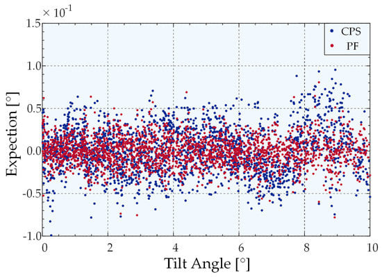 Following the use of the advanced peak extraction algorithm to accurately obtain the peak position, it is crucial to identify ways to select the appropriate fitting algorithm for the calibration surface to ensure the accuracy of the predicted angle. To clearly show the effectiveness of the proposed new partition fitting strategy, we compared the error performance associated with the use of the partition fitting strategy (PF) and classical polynomial surface fitting (CPS) subject to the premise of using the MSN peak extraction algorithm, as shown in Figure 16. The horizontal axis represents all the tilt angles in the range of 0°–10° in the R1 dimension in the test dataset. The ordinate represents the angle prediction error, where only 1D tilt occurs in the R1 dimension, and the projection of the R1 dimension from the angle error, where the two dimensions of R1 and R2 are simultaneously deflected. Figure 16 illustrates that the angle prediction error of the new partition prediction fitting strategy is significantly smaller than that of the fifth-degree polynomial surface fitting of the overall calibration data based on the assumption that the same peak-extraction algorithm was used. The average prediction errors of CPS and PF were 0.021495139° and 0.013430807°, respectively. Accordingly, it can be concluded that the accuracy of the system can be significantly enhanced by improving the prediction accuracy of the partition prediction fitting strategy by 37.53%.