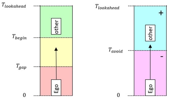 Depending on the time of the collision , a punishment value is subtracted from the distance traveled during the planning horizon. The expression differentiates between a collision that can be avoided (later than ) and a collision that is inevitable, resulting in a negative fitness score. A graphic representation of these parameters is depicted in Figure 3.