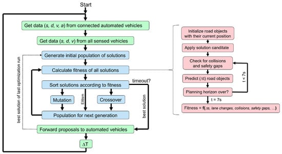 Currently, the presented algorithm is only operational in a simulation environment. Subsequently, the aim was to implement this approach on our autonomous prototype vehicles and evaluate it under real driving conditions—initially on test tracks, and subsequently on public highways. Thinking even further into the future, the algorithm would have to be optimized to work with a reasonable number of vehicles. Hence, the choice of the genetic algorithm, due to the critical part—the fitness calculation—can be easily parallelized and scaled up to realistic sizes. The ultimate goal would be to migrate the outlined approach to the infrastructure of the mobile network operator, as a so-called MEC service [].