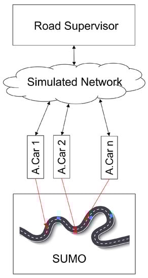 Designing, implementing, optimizing and testing such an approach on a fleet of real automated connected vehicles would be extremely time consuming and dangerous. Instead, an appropriate simulation environment had to be used. From the variety of vehicle- and traffic-simulation tools available nowadays, SUMO [] was chosen. Among other advantageous features (i.e., freely available), the level of abstraction, as well as the open interface TraCI, were essential for this decision. This way, the implementation could be tested and the parameters optimized for a variety of traffic situations.