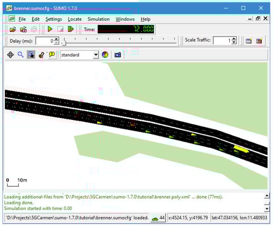 The base traffic is generated the SUMO way by defining vehicle types and their probability of occurrence within the rou.xml configuration file. Several scenarios with a similar traffic density can be generated by starting SUMO with different seed values for the internal random number generator. Figure 6 depicts a running SUMO simulation consisting of several automated connected vehicles (green, red) and the base traffic (yellow).