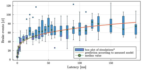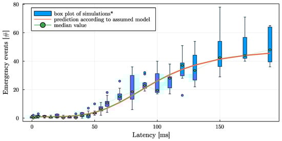 As can be expected, with increasing communication latency, significant brakings and emergency interventions increase. With very high communication latencies, collisions start to occur. By varying the base traffic seed value while keeping the traffic density similar, the plots in Figure 8 and Figure 9 have been created. The results of 10 scenarios are plotted simultaneously, and a trend line was fitted. The box-plot has three components: (i) a blue box spanning the interquartile range (IQR) with a green point marking the median; (ii) a thin error-bar whose whiskers span 1.5 * IQR; and (iii) additional blue points marking outliers, that are data outside the whiskers.