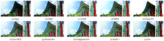 - Guo, X.; Li, Y.; Ling, H. LIME: Low-light image enhancement via illumination map estimation. IEEE Trans. Image Process. 2016, 26, 982–993. [Google Scholar] [CrossRef] [PubMed]