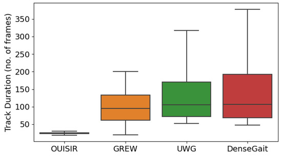 Similarly to UWG [11], DenseGait does not contain multiple walks per person, rather each tracklet is considered a unique identity. Compared to other large-scale datasets, DenseGait tracks individuals for a longer duration, which makes it suitable for use in self-supervised pretraining, as longer tracked walking usually contains more variability for a single person. Figure 1 shows boxplots with a five-number summary descriptive statistics for the distribution of track durations in each dataset. DenseGait has a mean tracklet duration of 162 frames, which is significantly larger (z-test p < 0.0001) compared to other datasets: CASIA-B [15]—83 frames, FVG [8]—97 frames, GREW [12]—98 frames, UWG [11]—136 frames). Due to potential loss of tracking information, the dataset is noisy, and can be used only for self-supervised pretraining.