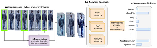 Appearance attributes are essential for pretraining for tasks such as gender estimation [19], age estimation [66] and pedestrian attribute identification [16,17,18]. To ensure that the dataset is densely annotated with appearance attributes, we made use of an ensemble of pretrained PAI networks, each trained on different popular PAI datasets. Specifically, we employed three InceptionV3 [67] networks trained on RAP [68], PETA [69] and PA100k [16], respectively. Figure 2 showcases the annotation procedure.