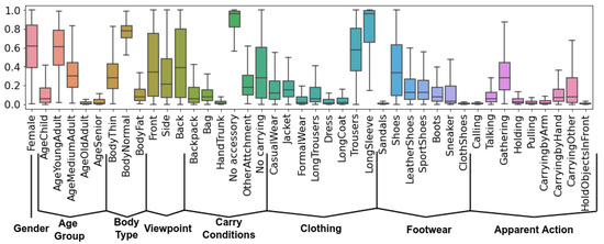 Figure 3 showcases the final list of attributes, and their distribution across the dataset. We have a total of 42 attributes, split into 8 groups: Gender, Age Group, Body Type, Viewpoint, Carry Conditions, Clothing, Footwear and Apparent Action. For the final annotations, we chose to keep the soft-labels and not round them, as utilizing soft-labels for model training was shown to be a more robust approach when dealing with noisy data [70].