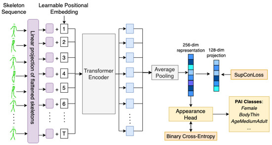 To handle skeleton sequences, we abstain from making any hand-crafted architectural modifications, as in the case of Plizzari et al. [27], which uses a hybrid approach by combining graph computation on the skeleton and using multi-head attention on the extracted features. Instead, we take inspiration from ViT [56], which processes images as a sequence of flattened patches that are fed into a standard transformer encoder network. Figure 5 showcases the training procedure for GaitFormer in the multi-task training regime. Each skeleton is flattened into a 54 dimensional vector and is linearly projected with a standard learnable feed-forward layer into a 256 dimensional space. Each skeleton projection is then fed into a transformer encoder network. We opted for learnable positional embedding that is added to each projection instead of concatenated, to avoid increasing the dimensionality. After the transformer encoder, representations for each skeleton are averaged, and a final linear feed-forward layer of 256 elements is used as the final embedding. Further, as described in SimCLR [29], we used an additional 128-dimension linear layer for training with a supervised contrastive objective [73]. Additionally, a linear layer is used as appearance head to estimate the pedestrian attributes that is trained using a standard binary-crossentropy loss.