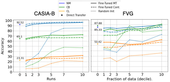 Figure 6 compares GaitFormerMD pretrained on DenseGait in the two training regimes (contrastive only—Cont. and Multi-Task—MT) and GaitFormerMD randomly initialized. The networks were fine-tuned on progressively larger samples of the corresponding datasets: for CASIA-B, we sampled multiple runs for the same identity (from 1 to 10 runs per ID), and for FVG, we randomly sampled a percentage of runs per each identity. Models were fine-tuned using Layer-wise Learning Rate Decay (LLRD) [77], which implies a higher learning rate for top layers and a progressively lower learning rate for bottom layers. The learning rate was decreased linearly from 0.0001 to 0, across 200 epochs. The results show that unsupervised pretraining has a substantial effect on downstream performance especially in low data scenarios (direct transfer and 10% of available data). Moreover, pretraining the model in Multi-Task learning regime, in which the network was tasked to estimate appearance attributes from movement alongside with the identity, provides a consistent increase in performance.