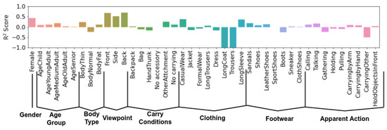For pedestrian attribute identification, we process a 10-h surveillance stream, corresponding to 10,733 tracklets, and use it for testing. For evaluation, we use the attribute pseudo-labels annotated automatically by the PAI ensemble. Figure 8 showcases R2 score results for GaitFormerMD trained with a multi-task objective. This score is computed relative to the soft pseudo-labels estimated by the PAI ensemble. We emphasize that the model only uses movement information to estimate these labels, and has no information regarding appearance. Using a skeleton-based model for pedestrian attribute identification is useful in situations where the appearance of the person is unavailable (i.e., in privacy-critical scenarios). The model is effectively distilling external appearance into movement representations.