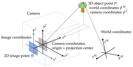 The direct projection model then describes the mapping of 3D point coordinates onto 2D pixel coordinates of the projection of point P on the sensor. The number of intrinsic parameters may be as low as four in the pinhole model in Figure 1 or reach thousands in high-quality metrological models. The basic model implemented in OpenCV has 18 parameters as described in Equation (A2).