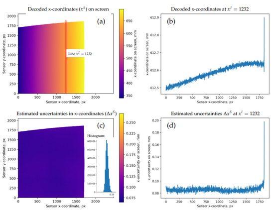 An example of a dense decoded data frame before filtering and sub-sampling is shown in Figure 3. Non-modulated pixels are identified during the decoding and are displayed as the white space in the maps. The panel (a) shows the decoded values , the panel (c)—estimated uncertainties . As should be expected, the high-frequency “jitter” in the coordinates that is visible, e.g., in the cutout 1D profile (b), has a typical amplitude that is close to the respective estimates in (d). In this particular case, the mean decoding uncertainty is about 0.09 mm, which is roughly the same as the screen pixel size of our Display 2 (that was used to collect these data). Note that the decoding works even with a partial view of the target; by contrast, many simple checkerboard detectors require a full unobstructed view of the entire pattern. This may lead to systematic undersampling and reduce the reliability of calibrated models near the frame boundaries [7].