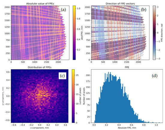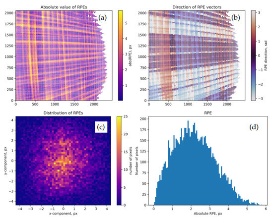 It is a common practice to inspect residual RMS values and per-pose maps of RPEs and FPEs computed for such as in Figure 4 and Figure 5. In the best case, typical FPEs should match the level of uncertainties if these are available. RPEs, in turn, may be compared with the diffraction-related blurring scale for the optics measured in pixels. For example, in our experiments, the size of the diffractive spot on the sensor is about 4 μm, which corresponds to 1–2 pixels. A significantly higher level of RPEs/FPEs and the presence of prominent large-scale non-uniformities in per-pose error maps may indicate data collection issues (cf. Moiré structures in Figure 4 and Figure 5), convergence problems in optimization, or an excessively “stiff” model (the situation known as “underfitting”).
