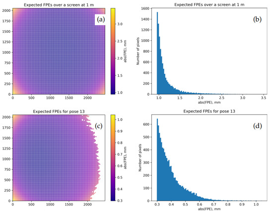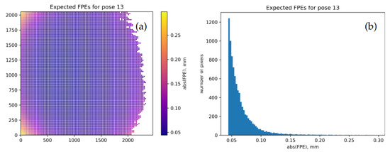 Expected FPEs (EFPEs) for the same model and camera pose as in Figure 5 based on . (a): map of point-wise values over the sensor. (b): histogram of EFPE values.