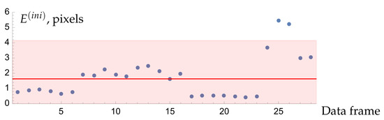 for the data frames and the respective camera parameters , , and () extracted from . We expect that the RPEs for the “good” frames will “cluster” together, while the “bad” frames will demonstrate significantly different residual errors. For example, Figure 7 shows residual per-pose RPEs for all 29 poses in our dataset 0. Indeed, the values appear to group together except for a few points. In this particular case, the “problematic” frames correspond to the camera being placed too close to the screen (at about 10 cm); the finite entrance aperture of the lens and the mismatching focus then lead to a high dispersion of the decoded point coordinates.