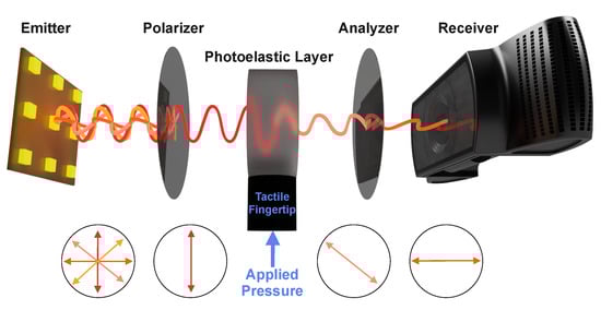 The authors of [] developed the photoelasticity-based approach to analyze foot images in the whole-field sensing applications for diabetic people. In contrast to the aforementioned approach, photoelasticity could also be applied in haptics. For example, the authors of [] developed a touch panel based on the photoelastic effect. The authors showed that the detected pressure can be used for scrolling the mouse in a personal computer.