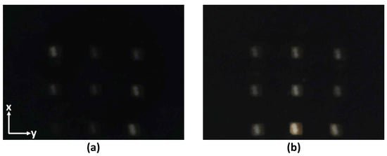 A 920 × 1080 pixels consumer-grade web camera (Logitech C920, Switzerland) was used to observe the photoelastic effect by capturing the change of the intensity of light at 30 frames per second. To keep the frame rate in this range, the exposition of the camera was manually set to a low level (200 in the range between 3 to 2047 in the camera software), which prevents the saturation of the camera sensor’s by the light. The camera’s focus was also set to the minimum focus distance to ensure that the LED array stays focused (the camera’s focal length is only 3.67 mm, whereas the distance between the camera lens and the printed circuit board (PCB) of the LEDs array is 40 mm). The camera’s diagonal field of view (FOV) is , enough to capture all 9 LED lights in proximity. Examples of the snapshots taken by the camera capturing the light from this array are shown in Figure 4.